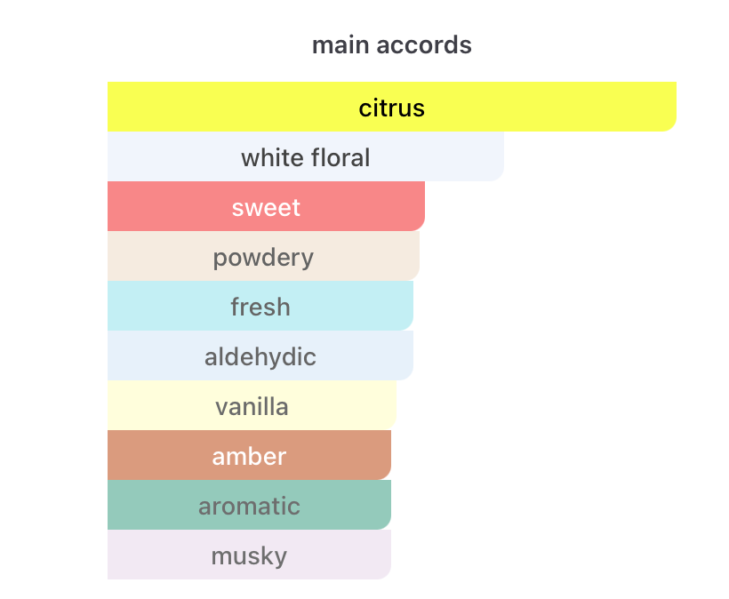 Top: White Peach, Bergamot, Mandarin, Orange and Aldehydes
